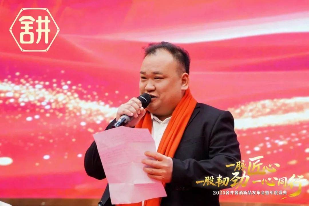舍井酱酒董事长陈科建登台致辞,并转达了酣客君丰酒业总经理佘小兵先生对全体家人的亲切问候。他系统回顾了2025年的坚实足迹:企业在广西、四川、广东三省稳步推进布局,实现“五店齐开”,并以“点对点”精准帮扶体系,持续为终端门店打造可持续的“造血”能力。